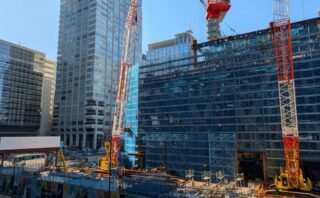浜松町駅の東側、「東京ポートシティ竹芝」と繋がるペデストリアンデッキの施工状況です。