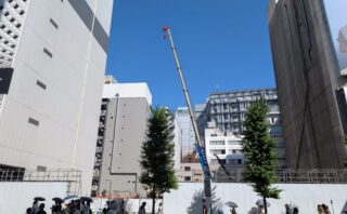 外苑東通りの西側へ進んで、建設中のB-2街区のタワークレーン達を見た様子です。