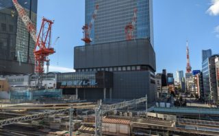 建物南側の新虎通り沿いからは、建物を写真に収める事が出来ませんでしたので、南の路地裏に入ってタワークレーンと共に建物を写真に収めてみました。