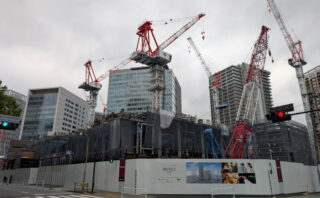 ヒカリエ側から建物の低層階を見ると、低層階もカーテンウォールの施工が始まっていました。