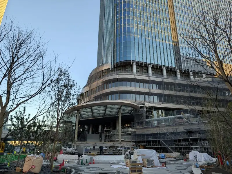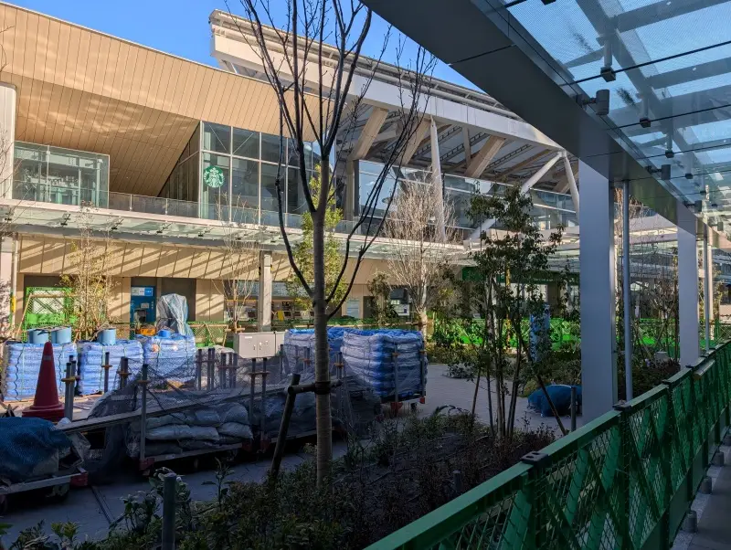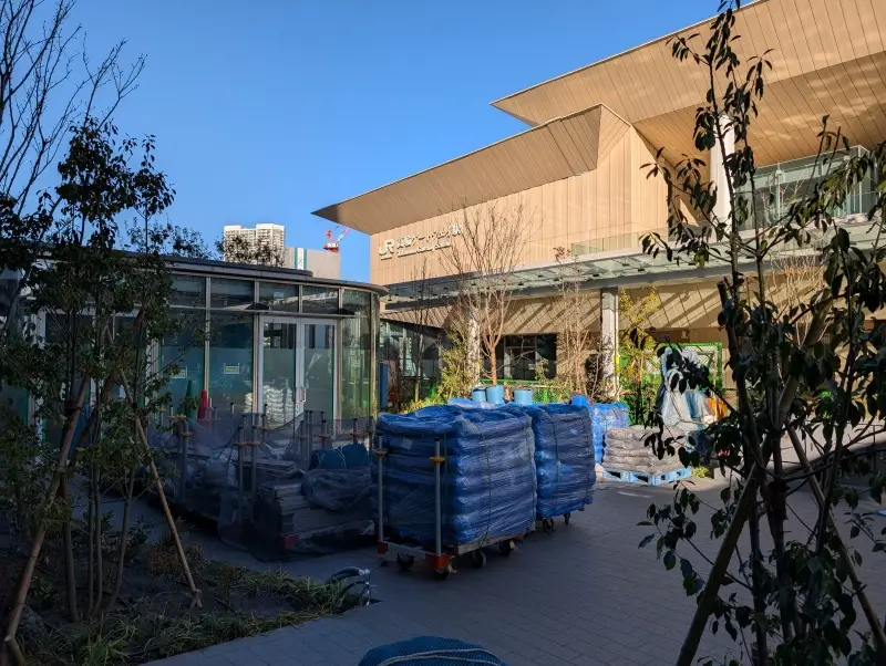 高輪ゲートウェイ駅前に行ってみました。工事用の白い壁が撤去され、駅前広場が見えるようになっていました。