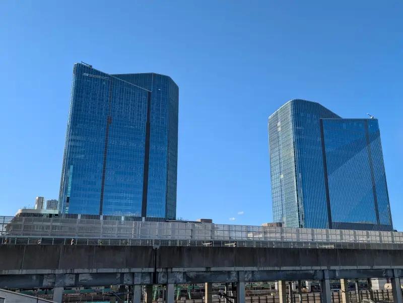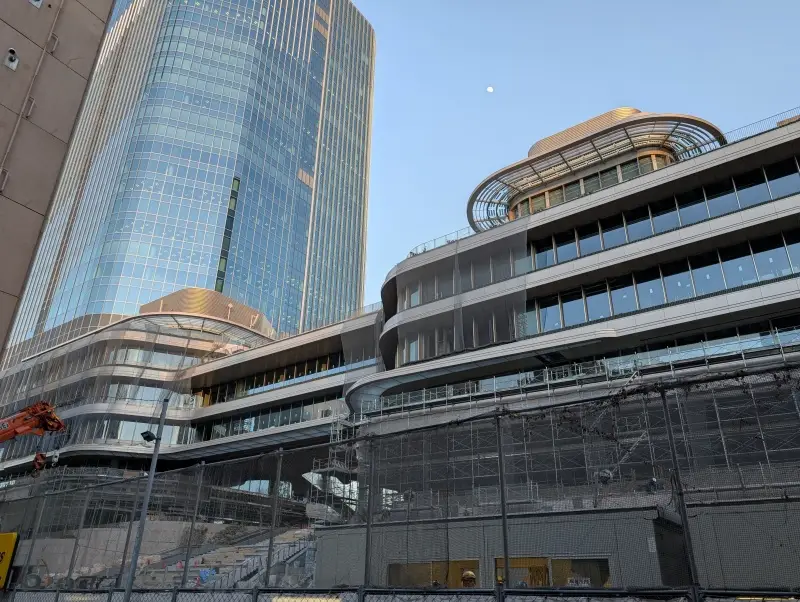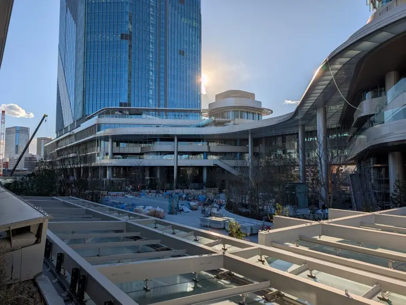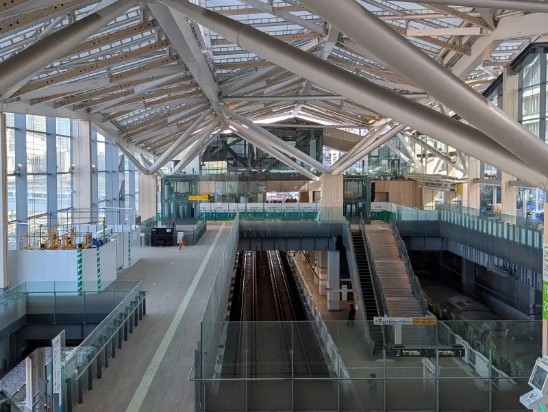 高輪ゲートウェイ駅の2階から、駅舎の南側を見た様子です。