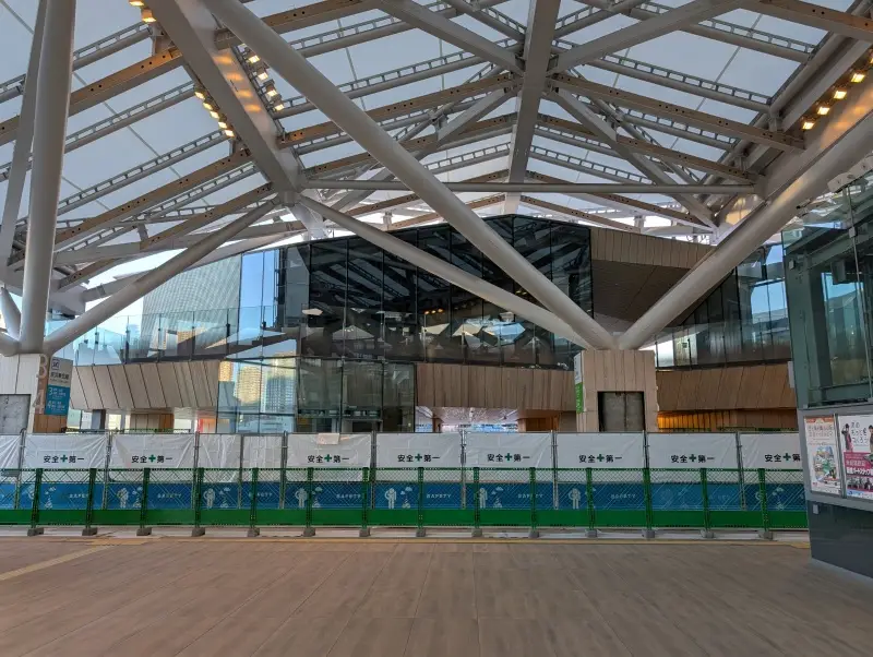 高輪ゲートウェイ駅の中に入り、高輪ゲートウェイ駅の南側から、西側の駅前広場に出る改札が出来る予定の場所を見た様子です。