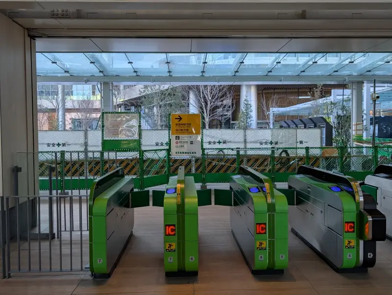 高輪ゲートウェイ駅の改札から、完成予定の駅前広場側を見た様子です。