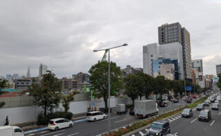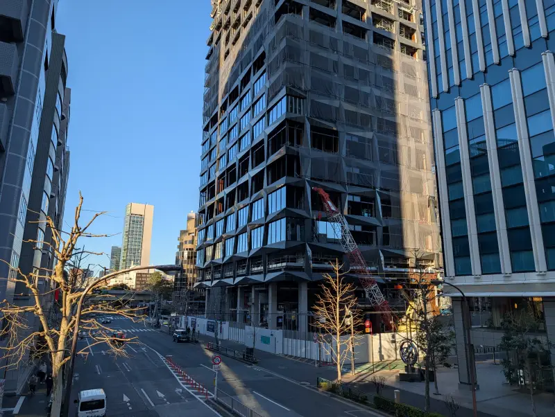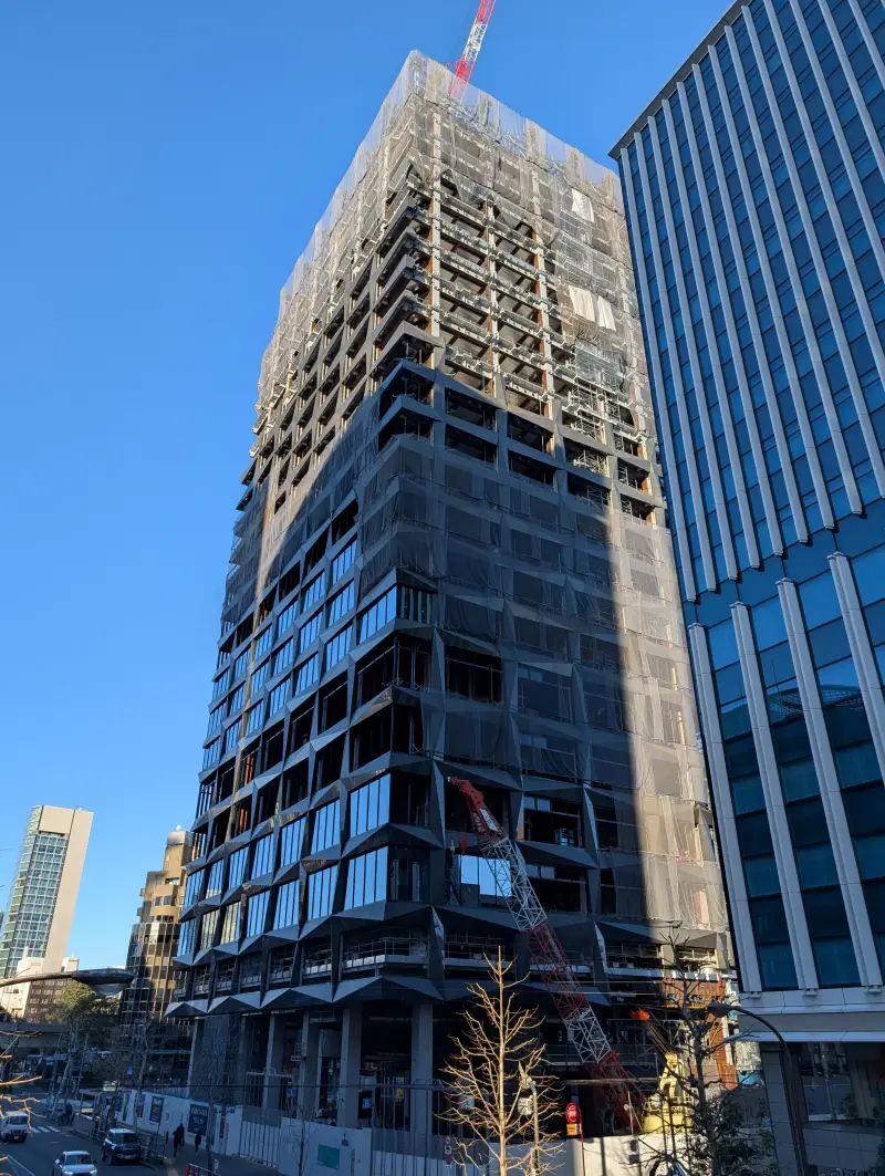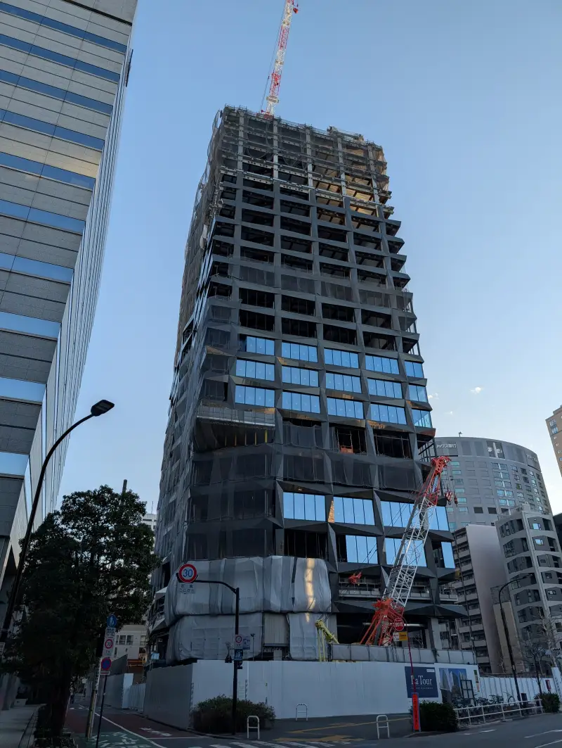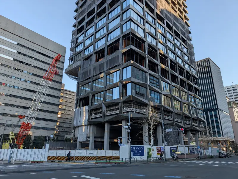 芝園橋交差点から、建設中の建物の低層階を見た様子です。