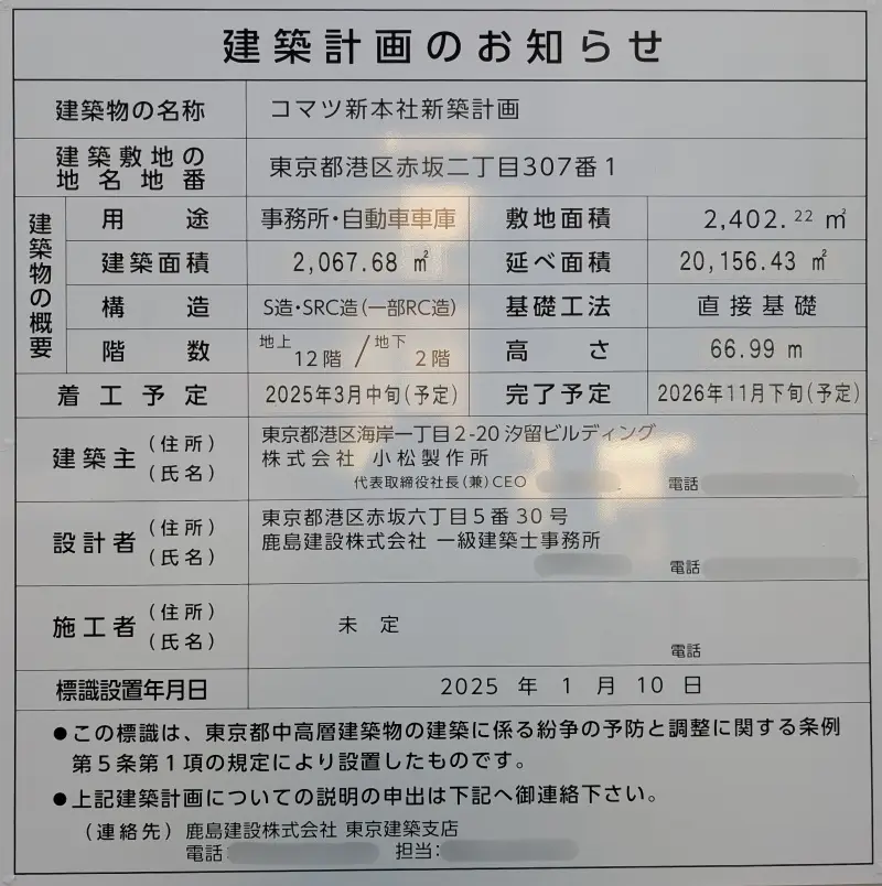 溜池交差点で建替え工事中の、12階66m「コマツ新本社新築計画」の様子です。あまり高い建物ではないので、見送ろうと思いましたが、工事用のフラットパネルが魅力的でしたので、撮影することにしました。