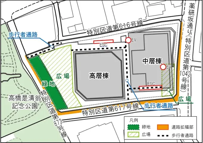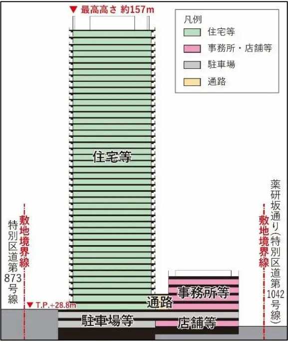 野村不動産さんの資料より、再開発の配置図です。薬研坂沿いに中層棟、真ん中に高層棟、西側に広場・緑地が出来る予定です。