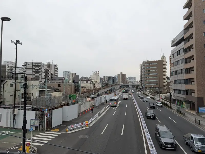 第一京浜沿いを南側に進み、北品川駅前の歩道橋から、八ツ山橋側を見た様子です。