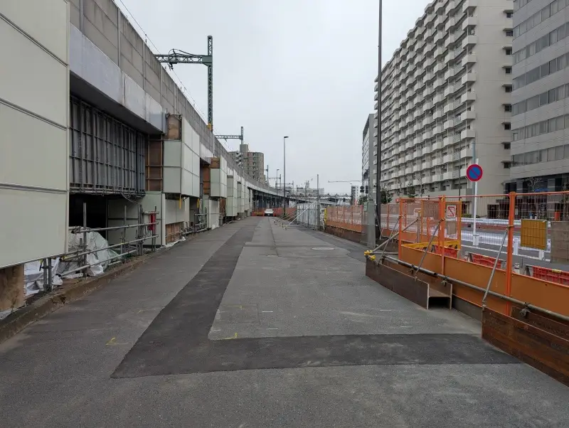 旧東海道沿いに進み、北品川駅方向を見た様子です。高架化のための敷地の確保が進んできていました。