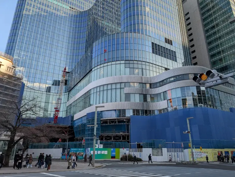日本橋北詰交差点付近から、再開発の敷地を見た様子です。C街区のガラスカーテンウォールの設置も、段々と進んでいました。