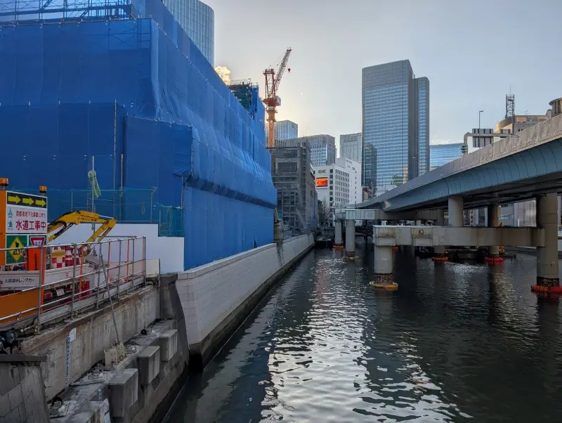 B街区傍の日本橋川沿いを、江戸橋の上から見た様子です。