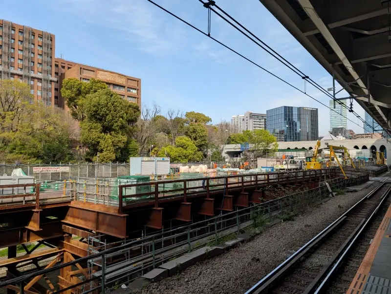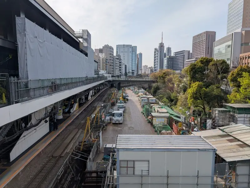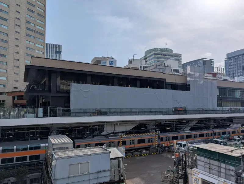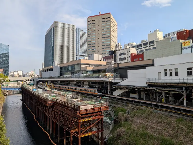 聖橋の上を北側に進み、御茶ノ水駅の駅舎を見た様子です。神田川沿いには、オープンテラスの「おちゃテラス」が出来る予定です。
