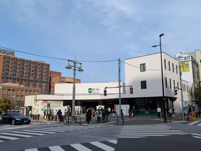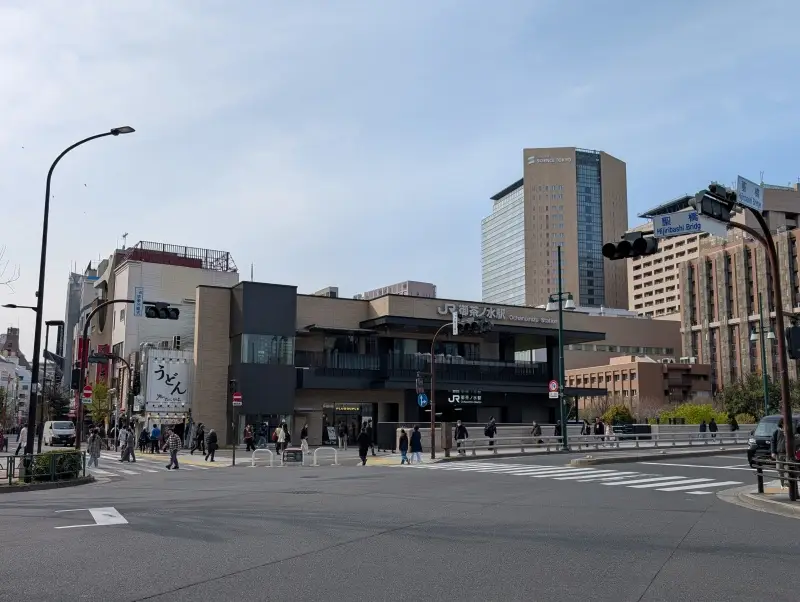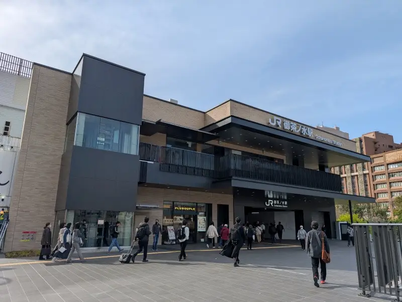 改札から出て、聖橋交差点側から、聖橋口駅舎側を見た様子です。