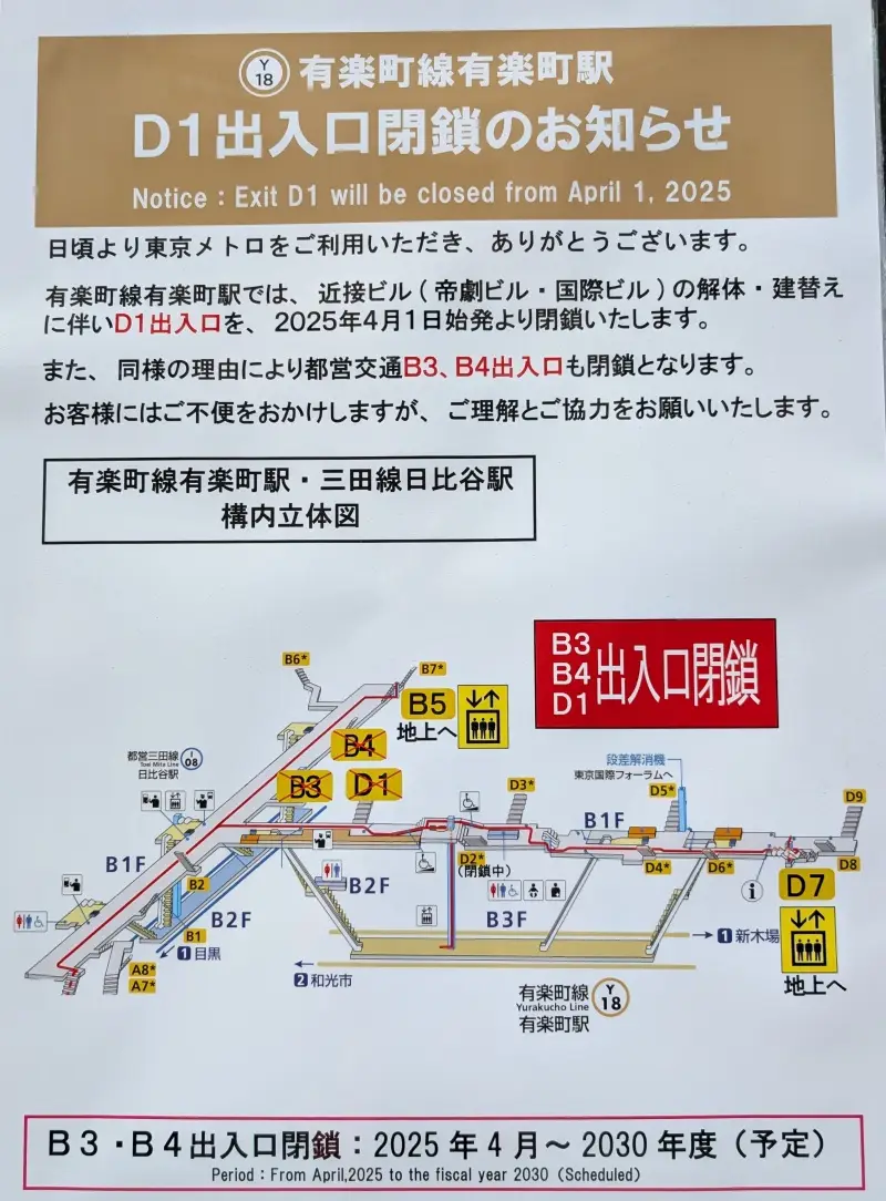 現地には、有楽町線有楽町駅の出入口閉鎖のお知らせが掲示されていました。B3,B4,D1出入口が閉鎖される予定です。
