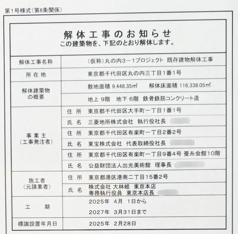 4月1日から解体工事が始まった、「(仮称)丸の内3-1プロジェクト(国際ビル・帝劇ビル建替計画)」の様子です。こちらには、約155m29階の建物が、2030年度に完成する予定です。