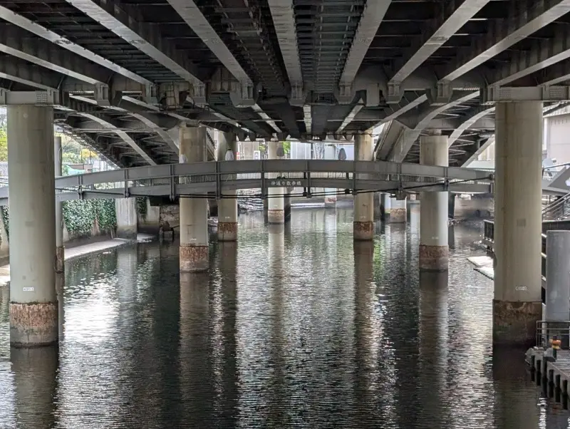 人道橋にズームしてみました。写真では読み辛いのですが、仲通り散歩橋と橋の横に記載されていました。また、千代田区のページにも、「仲通り散歩橋」に名称が決まったと書いてありました。防災用の船着場は、「鎌倉河岸船着場」という名称になったそうです。