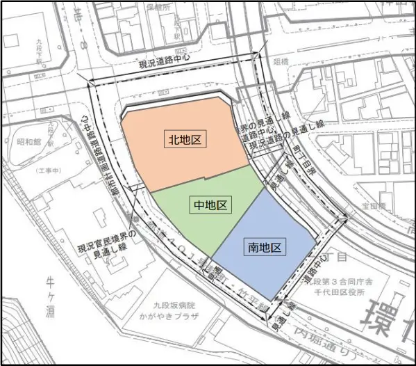 九段下交差点の南東側で再開発が予定されている、「九段南一丁目地区第一種市街地再開発事業」の様子です。こちらは、北地区・中地区・南地区と3つの街区に分かれており、北地区に約170m、中地区に130m?の建物が出来る予定です。(建築通信新聞さんの2025年2月10日の記事には、中地区は21階81mとなっていました。)