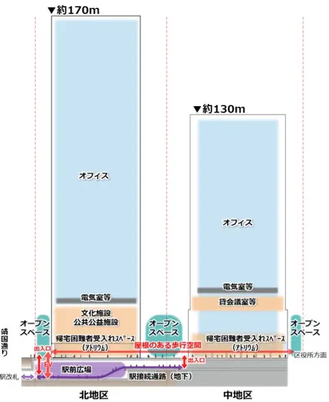 以下、国立研究開発法人建築研究所の、三井住友銀行/九段プロジェクトの資料より、中地区のイメージ図です。