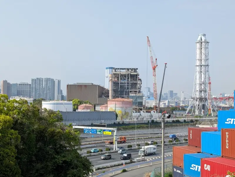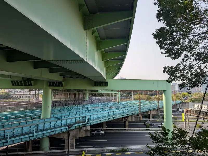 線路切り替え工事のエリアではないのですが、大井ふ頭側がどうなっているのか気になって、見に行きました。先ずは、大井北部陸橋から、北側を見た様子です。東海道貨物線の上に、建機が設置されているのが見えました。
