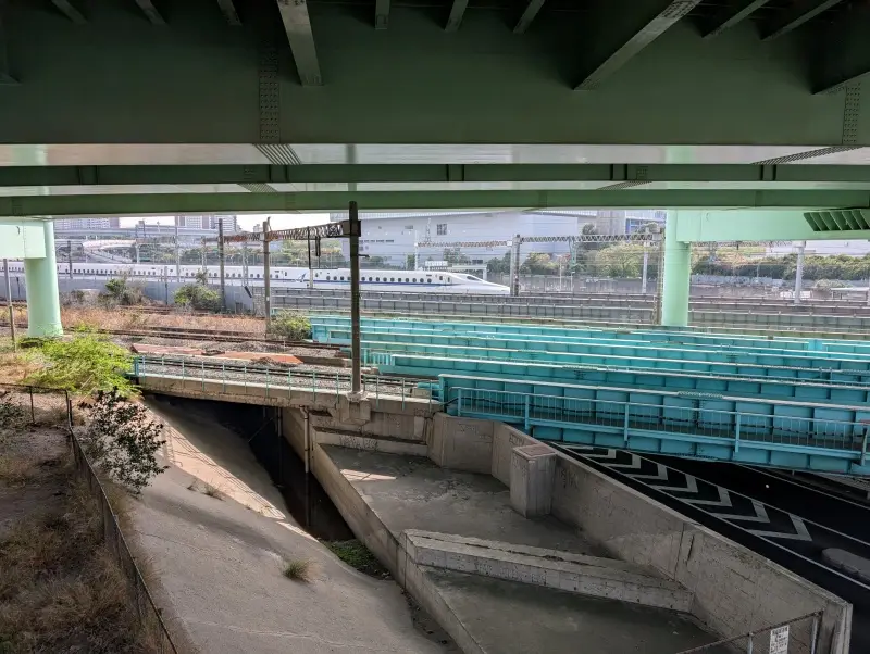 札の辻橋の上から、東海道貨物線の線路があった場所付近を撮影した様子です。