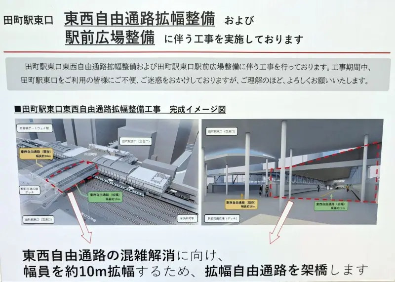 線路切り替え工事とは関係ないのですが、田町駅東口は東西自由通路拡幅工事が行われていました。