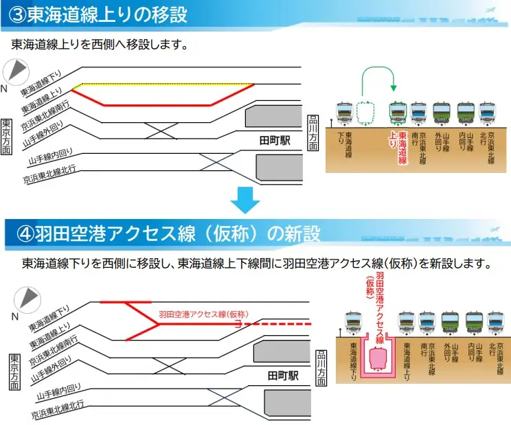 以下、今後行われる工事の予定です。東海道線上りが西側に移動し、東海道線の上りと下りの間に、羽田空港アクセス線(仮称)が地下に潜るための線路が出来る予定です。
