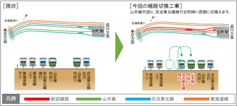 JR東日本が整備している、東京駅と羽田空港を繋ぐ、羽田空港アクセス線(仮称)に関連する、「羽田空港アクセス線(仮称)整備における田町駅付近線路切換工事」の様子です。