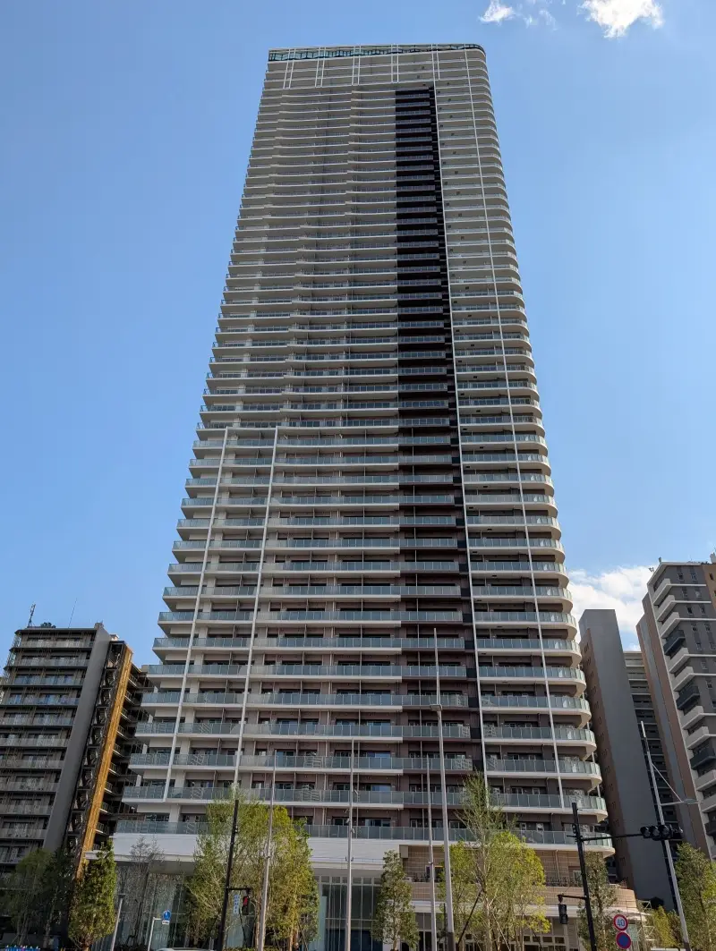晴海ふ頭で建設中の、179m50階「HARUMI FLAG SKY DUO」(晴海フラッグ スカイデュオ)の様子です。建物はほぼ完成しており、工事用の白いパネルも撤去され、低層階の整備が行われていました。