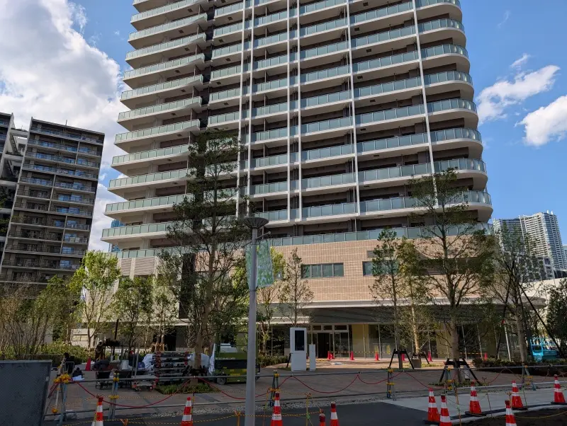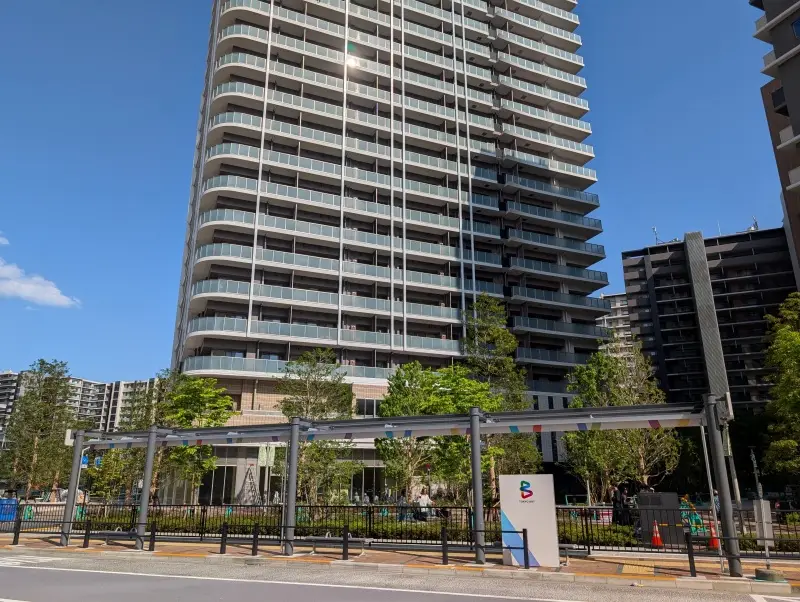 晴海ふ頭側に行き、「ららテラス HARUMI FLAG」近くから、東側のPARK VILLAGEタワー棟の低層階を見た様子です。