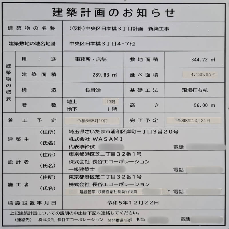 八重洲ダイビルから見て、八重洲通りの反対側で、13階56m「(仮称)中央区日本橋3丁目計画 新築工事」の建築計画のお知らせが掲示されていました。