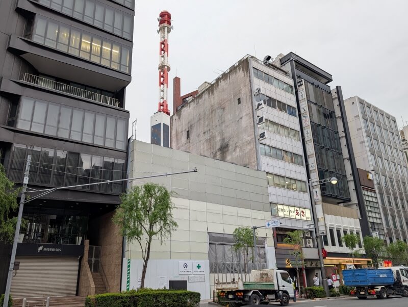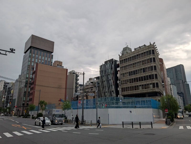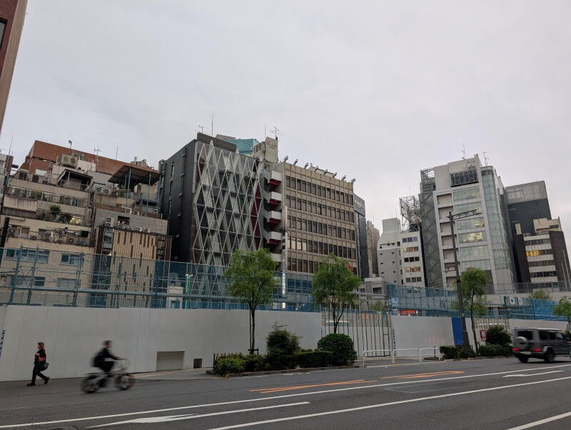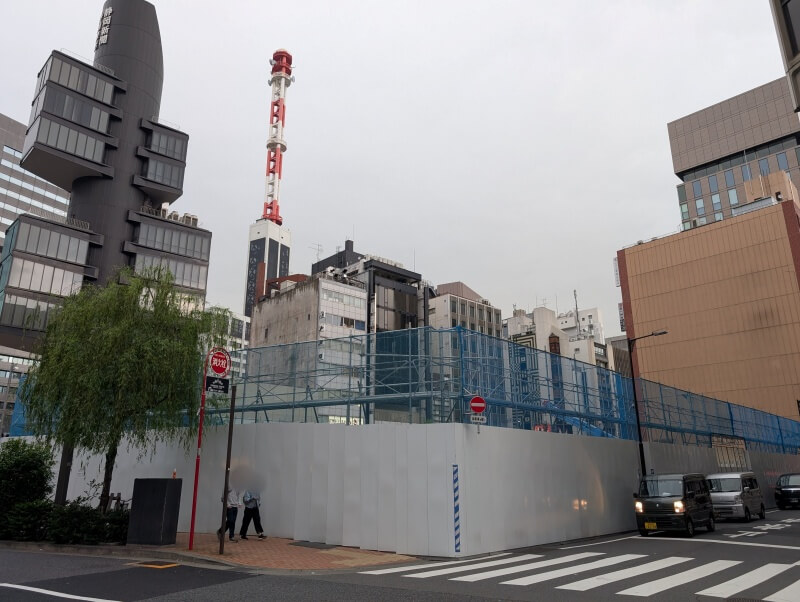 土橋交差点から敷地を見た様子です。「リクルート銀座8丁目ビル」が既に解体され、既存建物が既に見えなくなっていました。