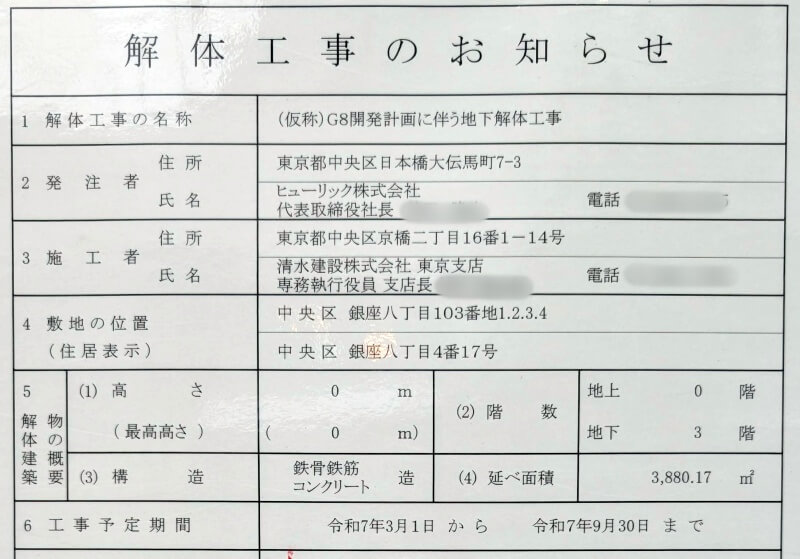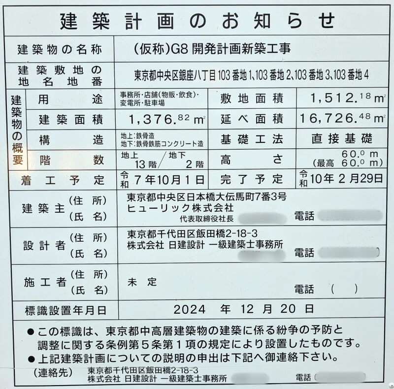 「リクルート銀座8丁目ビル」跡地の建替え工事が行われており、現地には13階60m「(仮称)G8開発計画新築工事」の建築計画のお知らせが掲示されていました。