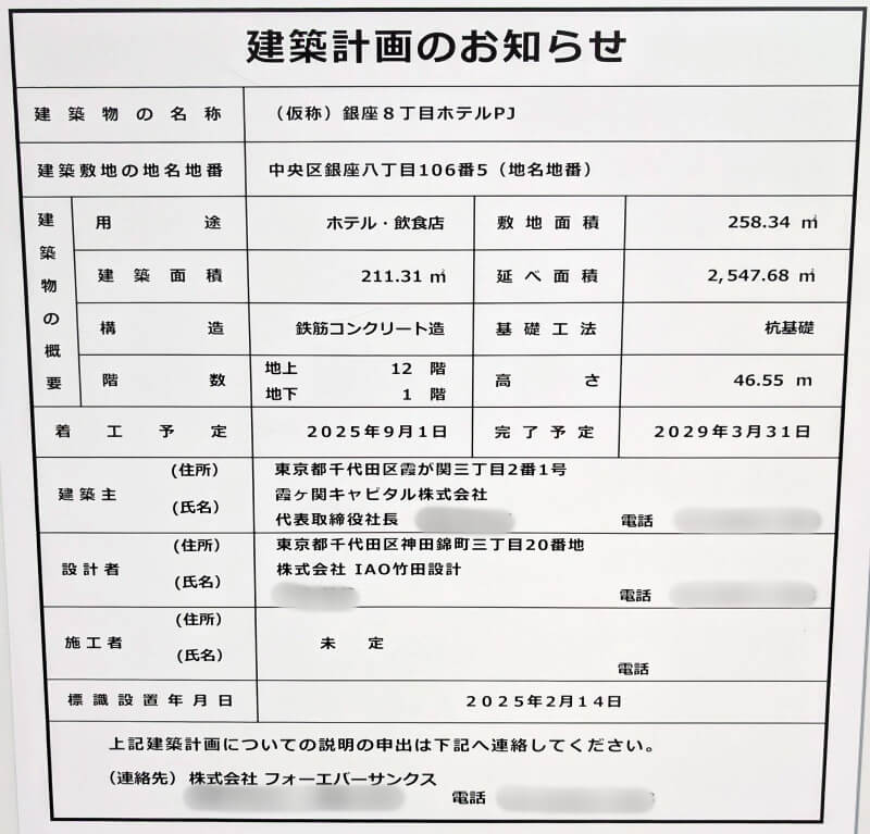 こちらには、12階46mの「(仮称)銀座8丁目ホテルPJ」という名称で、ホテル・飲食店が建設予定です。