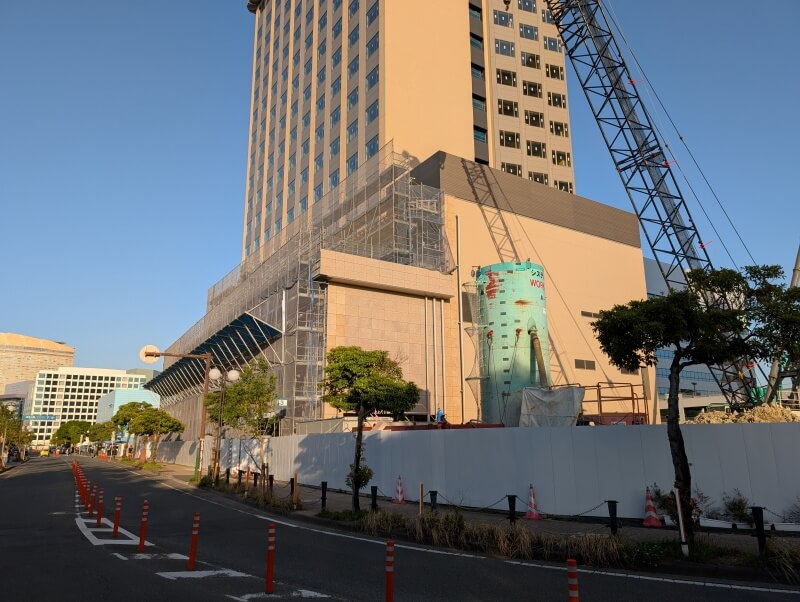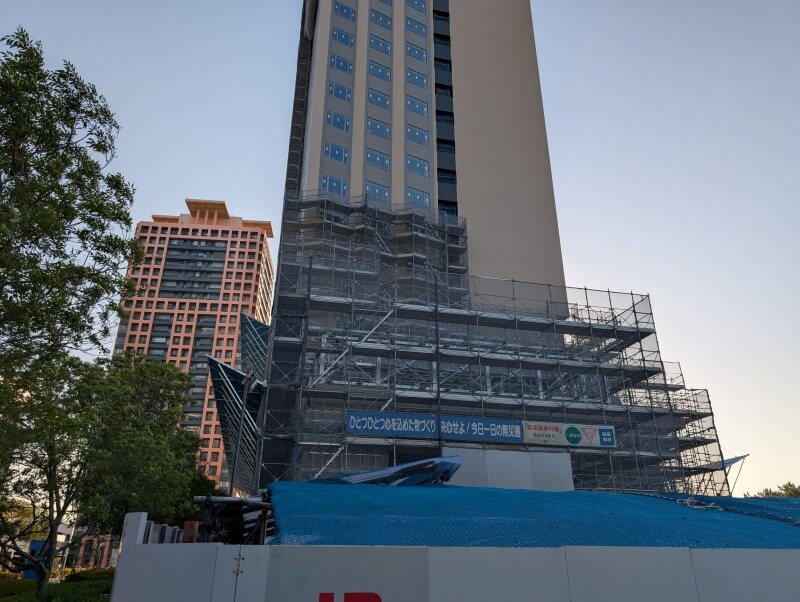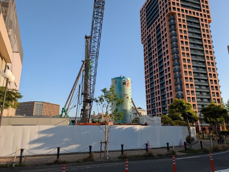 福岡タワーの展望台に行くのは諦め、完全に建物観察モードに移行しました。東側の福岡タワーの傍から、施工中の建物の低層階を見た様子です。