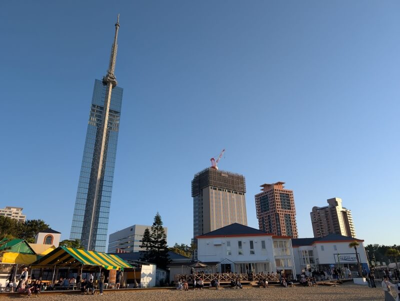 シーサイドももち海浜公園のももち浜から、建物を見た様子です。