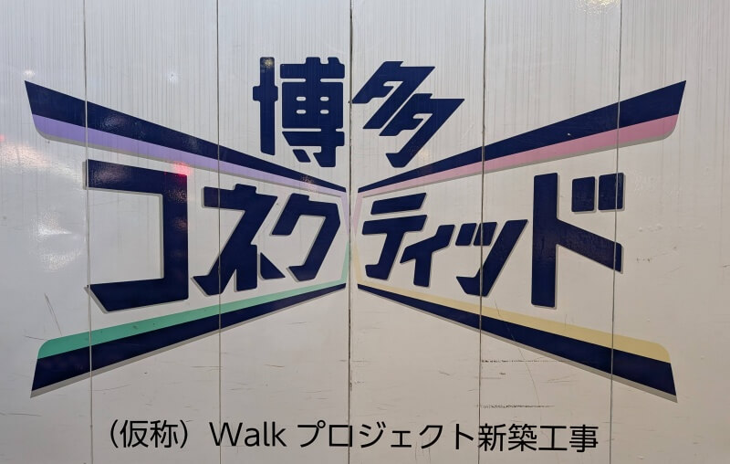 工事用の白いフラットパネルに設置されていた、工事の名称のパネルです。名称は、「(仮称)Walkプロジェクト新築工事」となっていました。