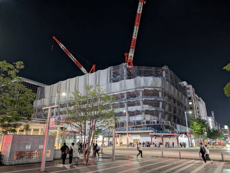 シーサイドももち海浜公園の後、食事をしたりして、真っ暗になり博多駅に向かいました。博多駅の西側でも、建物の建替え工事が行われていました。