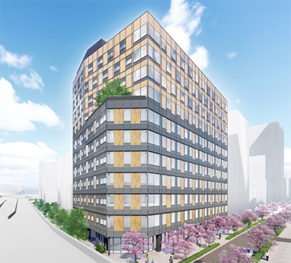 オカメザクラの並木道の「あじさい通り」の北東側から、施工中の建物を見た様子です。