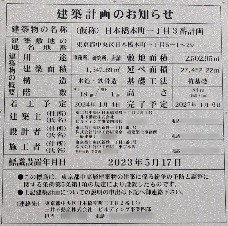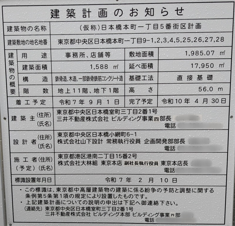こちらの建物の、三井不動産さんが建築主で、11階56m「(仮称)日本橋一丁目5番街区計画」となっていました。