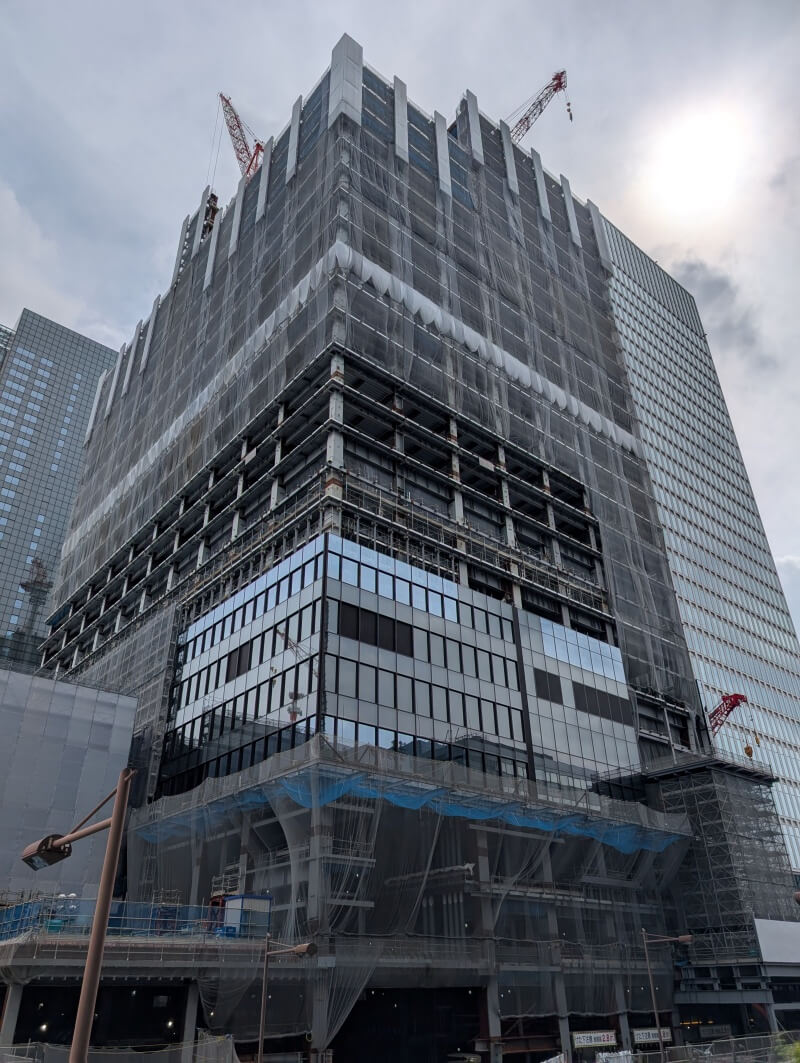 先週開業したブルーフロント芝浦に行ったついでに見てきました。鉄骨はオフィス部分が組み終わりセットバックしたホテル部分を組んでいるようでした。また下層階の三分の一から半分ぐらいまで外壁が取り付けられていた他ここから、文化放送へとつながる歩行者デッキに接続するデッキの鉄骨も組まれ始めていました。