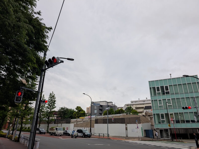 「住友不動産大崎ツインビル東館」と「品川区立大崎図書館」の間から建物を見た様子です。交差点に信号機の設置がされていました。