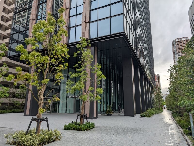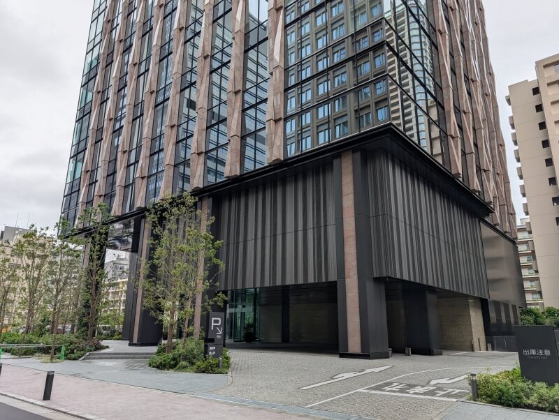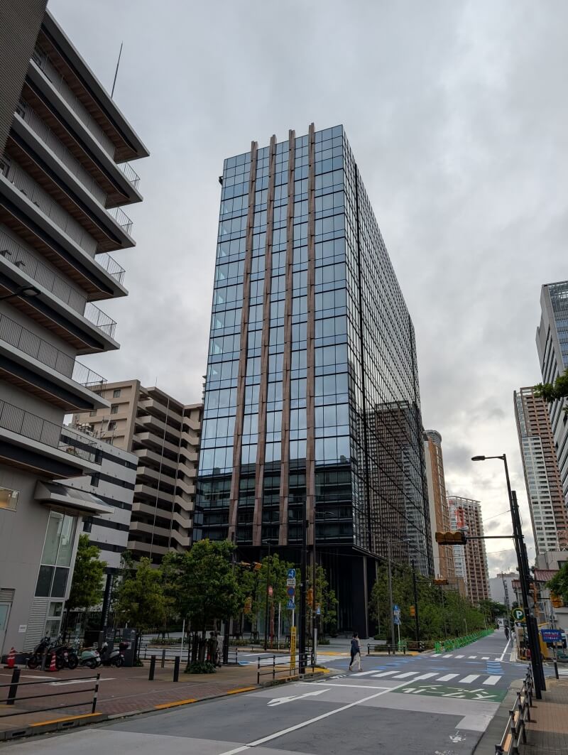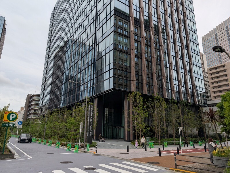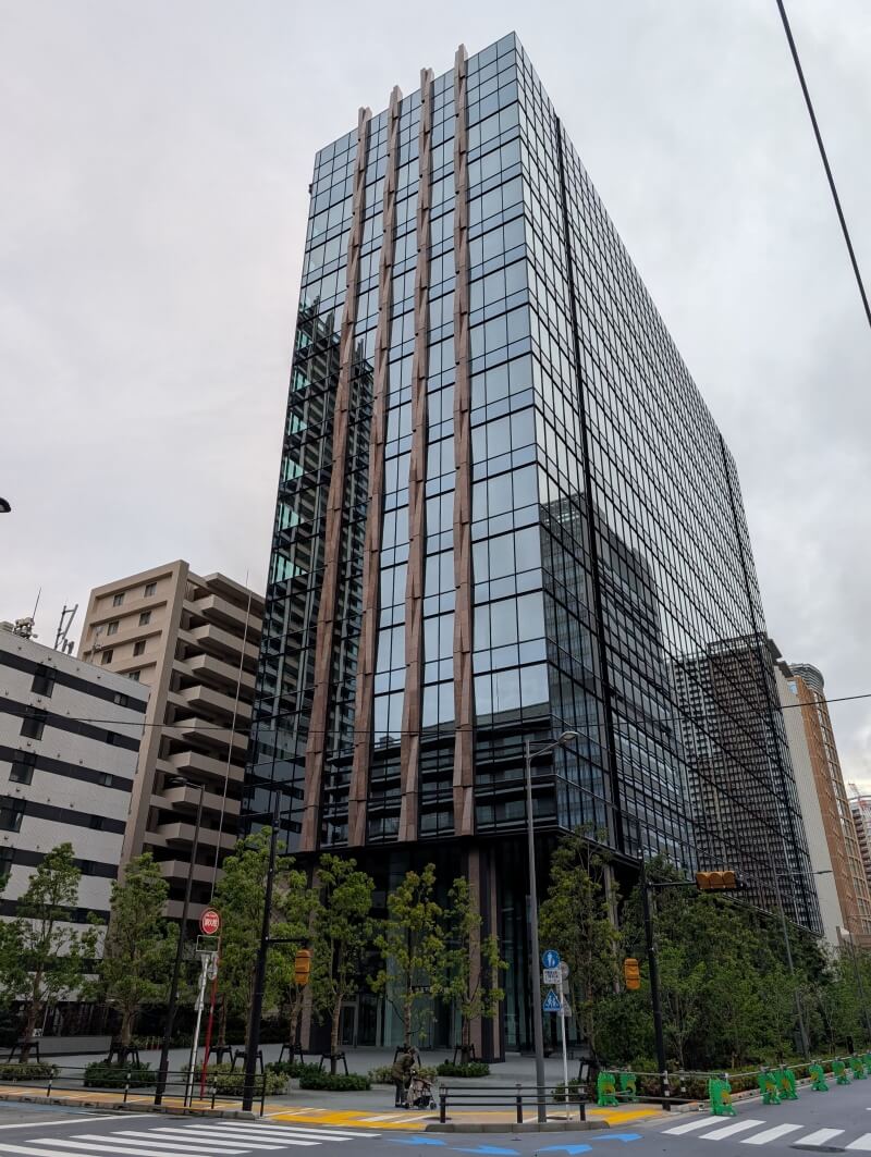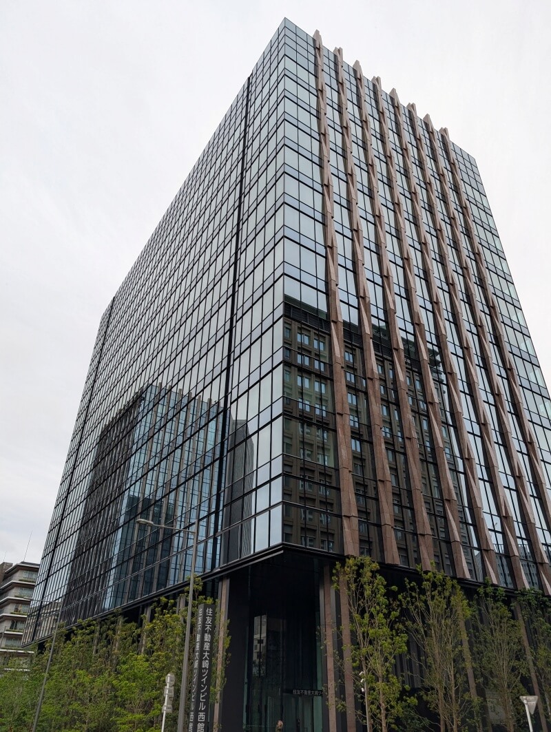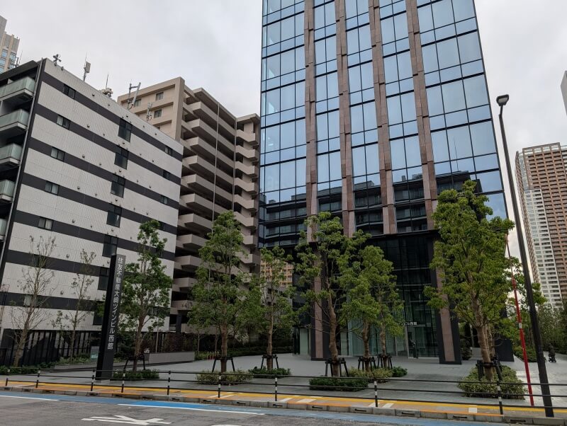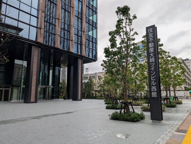 「住友不動産大崎ツインビル東館」と「住友不動産大崎ツインビル西館」の間の交差点から、西館の低層階を見た様子です。