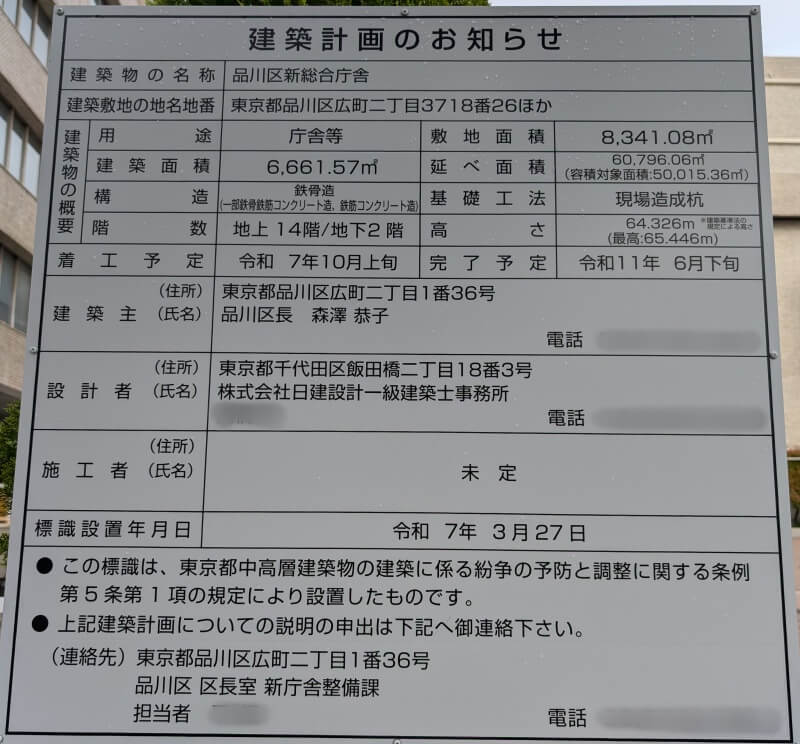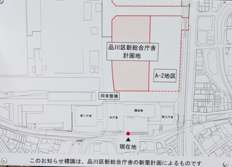 品川区役所の前には、「品川区新総合庁舎」の建築計画のお知らせが掲示されていました。