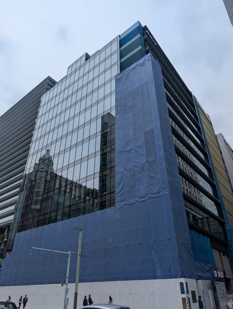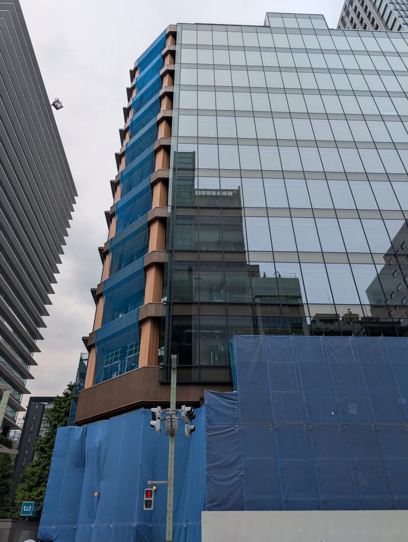 鍛冶橋通り沿いの、「東京スクエアガーデン」近くから躯体を見た様子です。工事中のカバーが取れて、建物が見えてきていました。