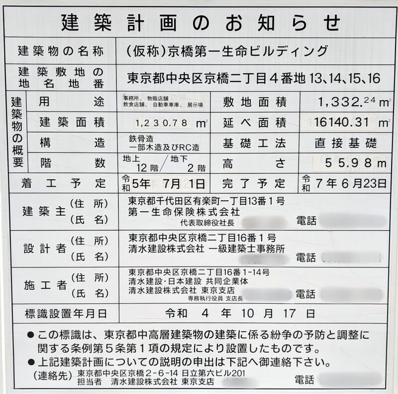 鍛冶橋通りと中央通りの交差する、京橋交差の角で建て替え工事中の、12階55m「(仮称)京橋第一生命ビルディング」の様子です。工事のカバーが取れ、躯体が見えてきていました。
