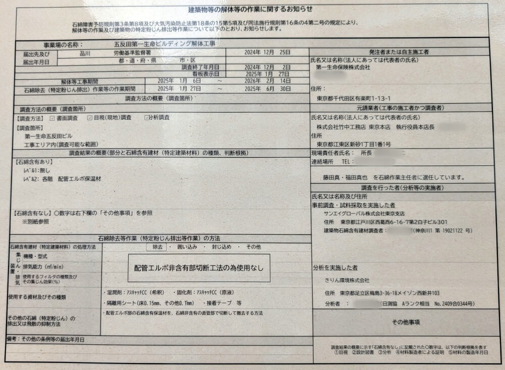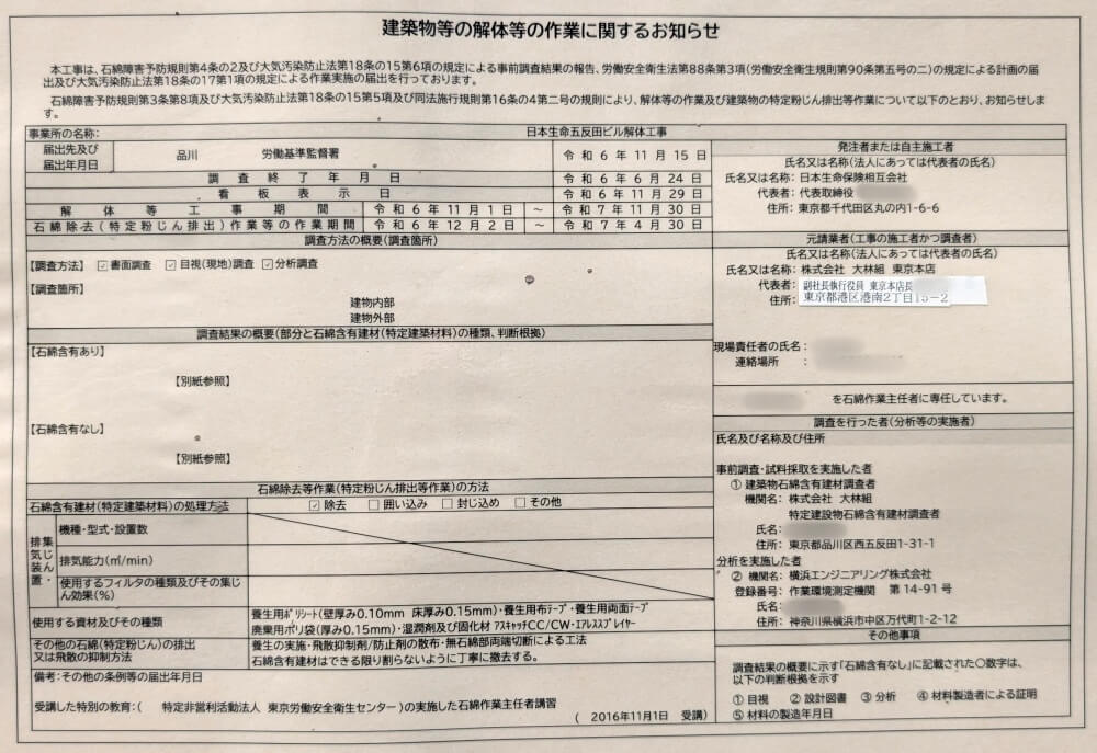 現地に掲示されていた、解体等の作業に関するお知らせです。