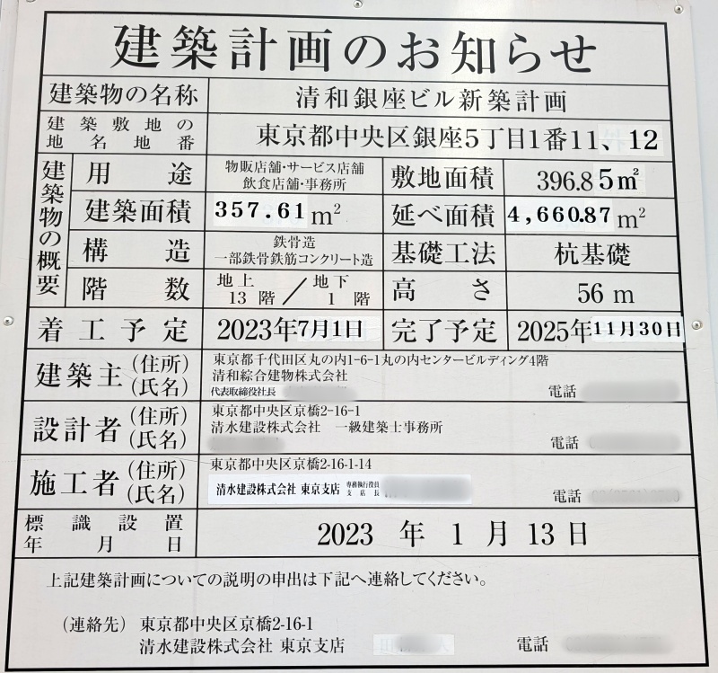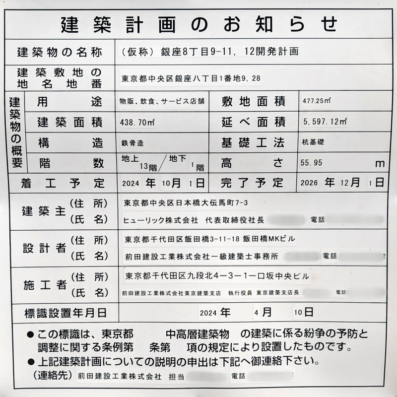 現地に掲示されていた、建築計画のお知らせです。銀座界隈ではお馴染みの、ヒューリック株式会社が建築主です。