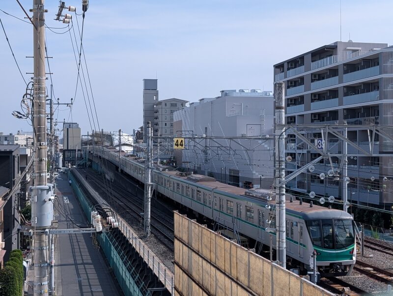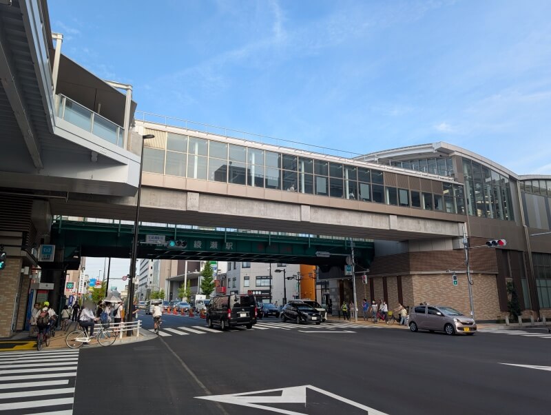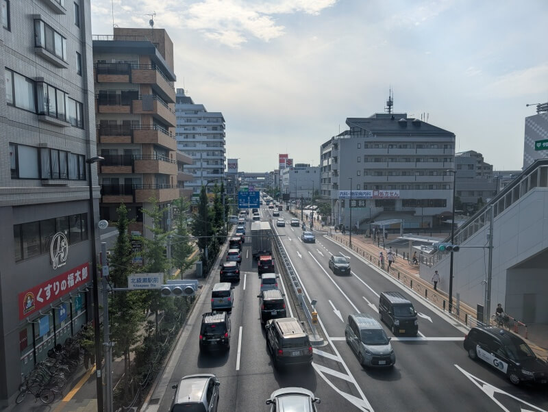 北改札を出た通路の上から、環状七号線の西側を見た様子です。
