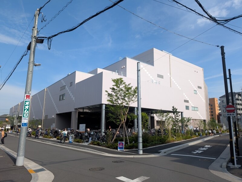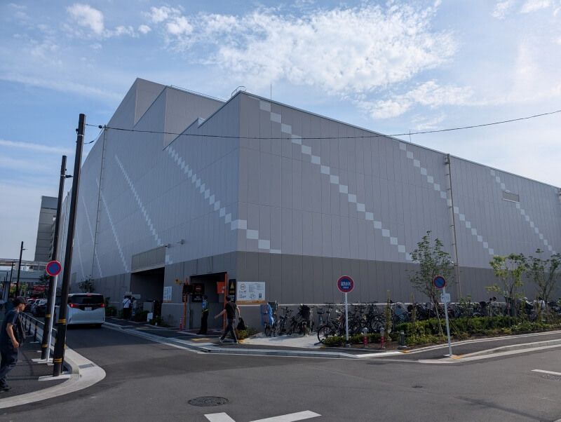北東側から「ららテラス北綾瀬」の建物を見た様子です。駐輪場に自転車がずらっと並んでいました。