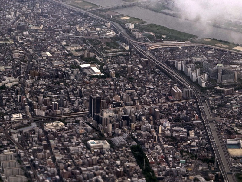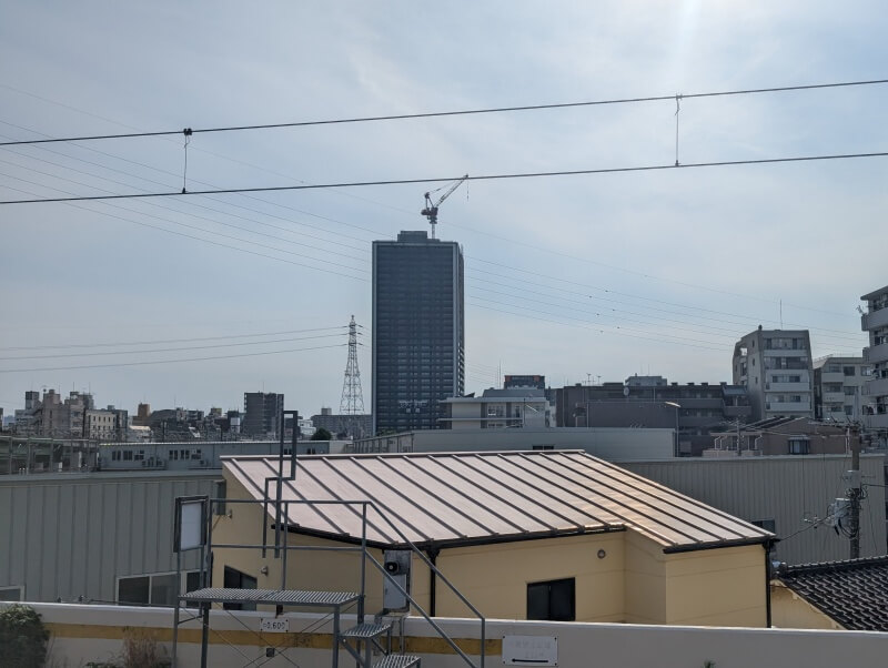 以下、2025年5月上旬に撮影した、羽田空港に着陸する途中の飛行機から見た建物の様子です。